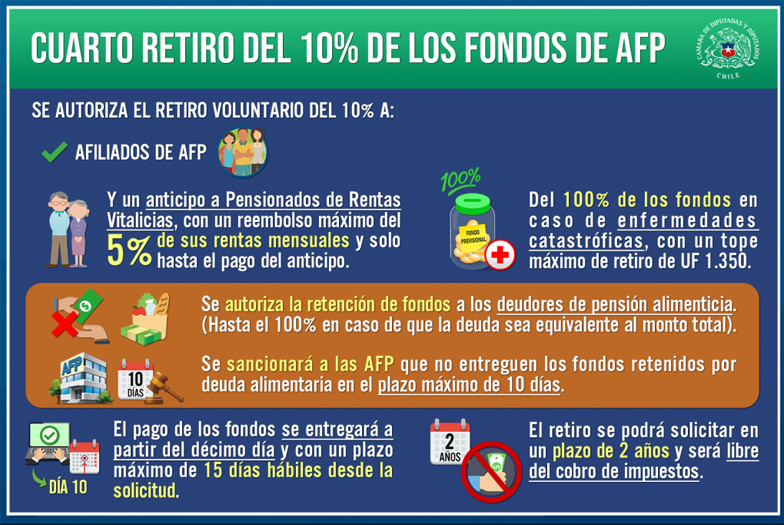 Así, el hemiciclo respaldó el texto despachado ayer por la Comisión de Constitución. Según éste, el nuevo giro, el cuarto en poco más de un año, no estará afecto a impuestos y tendrá un plazo de dos años que los afiliados lo soliciten.