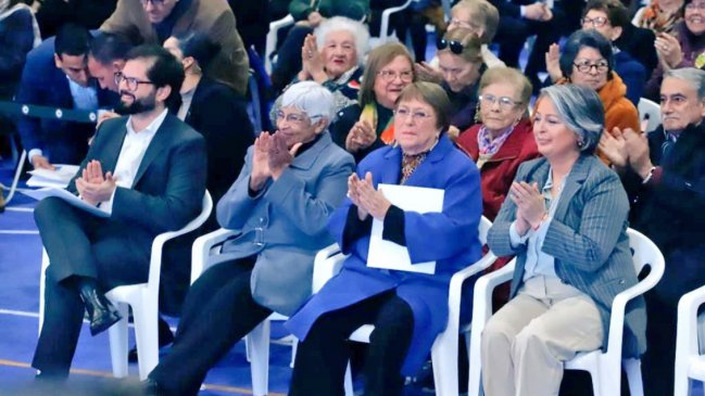 El evento, que contó con un público mayoritariamente jubilado, fue encabezado por el Mandatario, la expresidenta Michelle Bachelet (2006-2010, 2014-2018) y la ministra de Trabajo, Jeannette Jara.