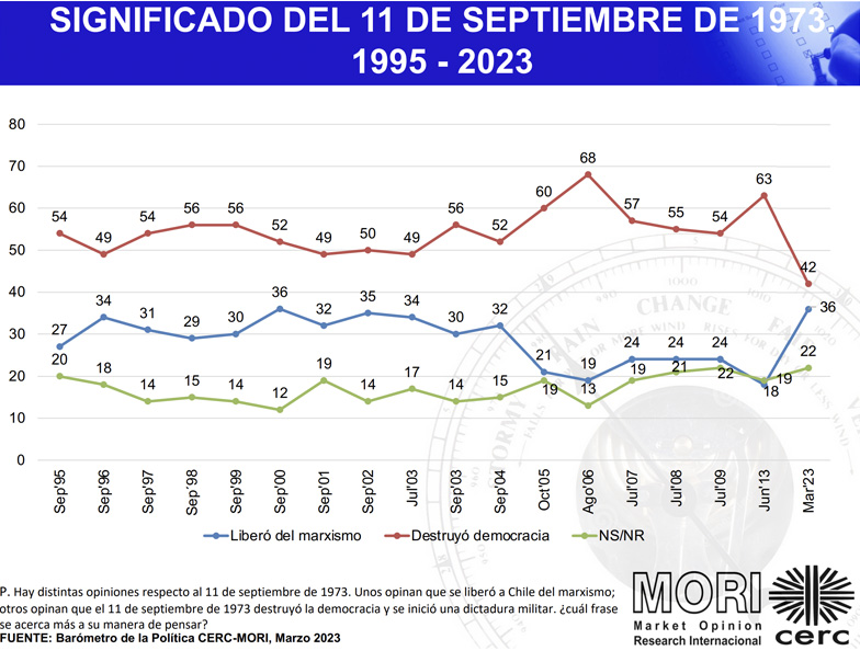 De acuerdo con la última medición, realizada este año, sólo el 42% de los chilenos considera que el alzamiento militar de 1973 destruyó la democracia, la menor cantidad de chilenos desde 1995, mientras que un 36% opina que "liberó" a Chile del marxismo, igualando el umbral máximo que había alcanzado el año 2000.
