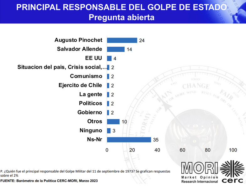 En ese sentido, frente a la pregunta sobre quién fue el principal responsable del golpe de Estado, los encuestados señalan en primer lugar a Pinochet (24%), en segundo a Allende (14%), mientras que el resto se diluye en menciones menores de otros culpables, aunque un 4% también menciona a Estados Unidos.