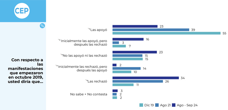 "Este apoyo ciudadano al mecanismo de estallido claramente no tuvo las consecuencias que se esperaban para resolver las demandas legítimas, y por lo tanto, su justificación y su apoyo (de hoy) podrían ir en esa línea", complementó.