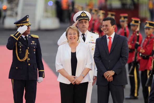 Al aterrizar en El Salvador, donde realiza una breve visita oficial, la Presidenta Michelle Bachelet fue recibida en el aeropuerto Internacional Monseñor Óscar Arnulfo Romero por el canciller Hugo Martínez, la embajadora María Inés Ruz y el alcalde Nayib Bukele, quien le entregó las llaves de la capital y la declaró