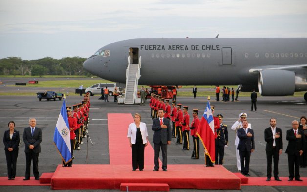 Al aterrizar en El Salvador, donde realiza una breve visita oficial, la Presidenta Michelle Bachelet fue recibida en el aeropuerto Internacional Monseñor Óscar Arnulfo Romero por el canciller Hugo Martínez, la embajadora María Inés Ruz y el alcalde Nayib Bukele, quien le entregó las llaves de la capital y la declaró "huésped distinguida" de San Salvador.